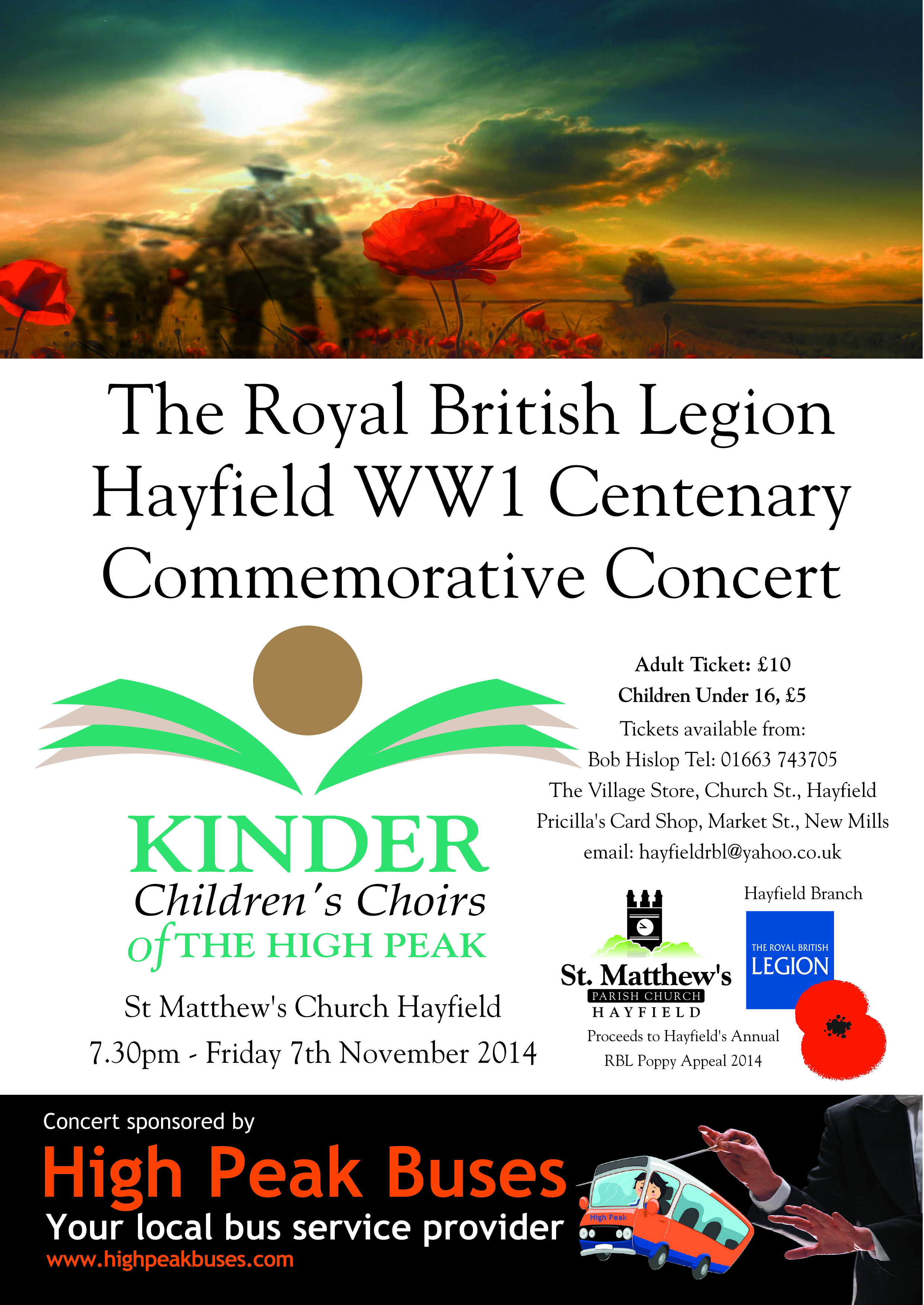 The Hayfield Branch of the Royal British Legion are organising a Poppy Appeal fundraising concert for the 7th November 2014 at St Matthews Church Hayfield and are very privileged to have secured the services of, the highly acclaimed and award winning Kinder Children’s Choir of the High Peak.